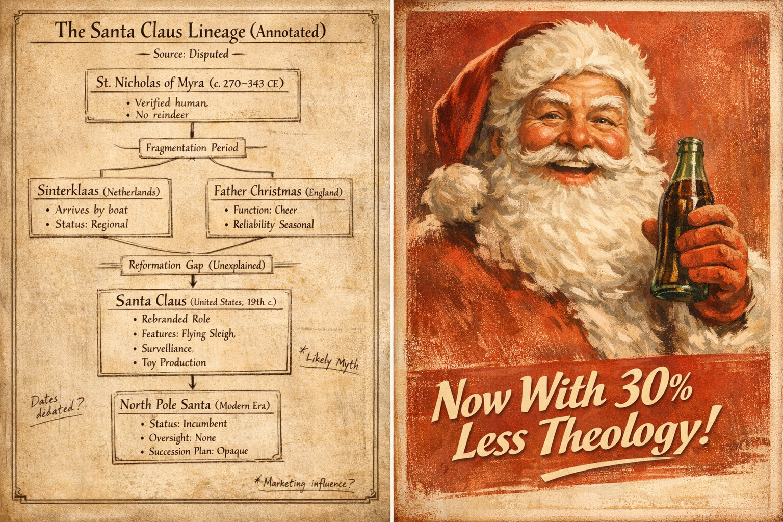 History maintains that Santa Claus has always existed—unchanged, eternal, and conveniently immune to scrutiny. This is soothing. It is also nonsense. Santa Claus was not born. He was assembled, revised, canceled, resurrected, rebranded, and eventually laminated for durability.
